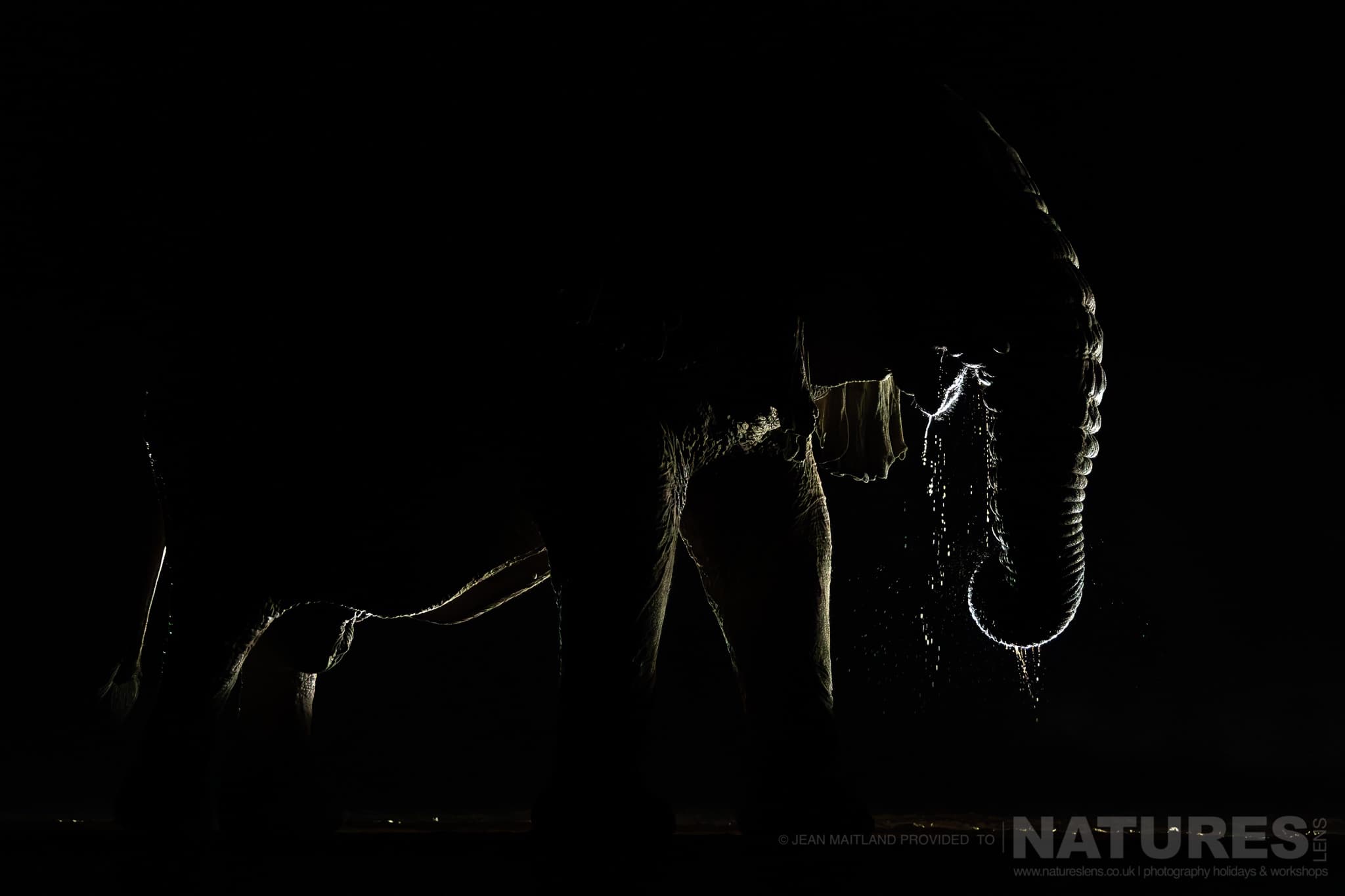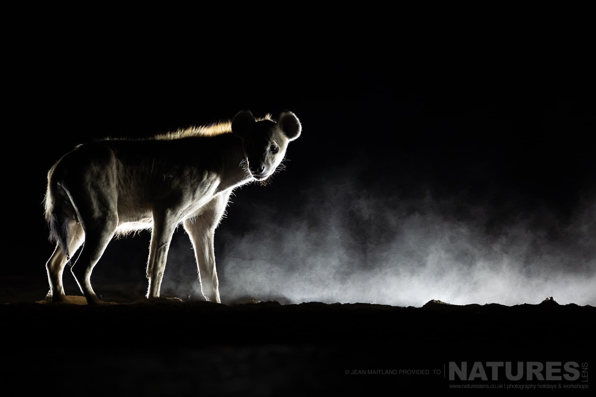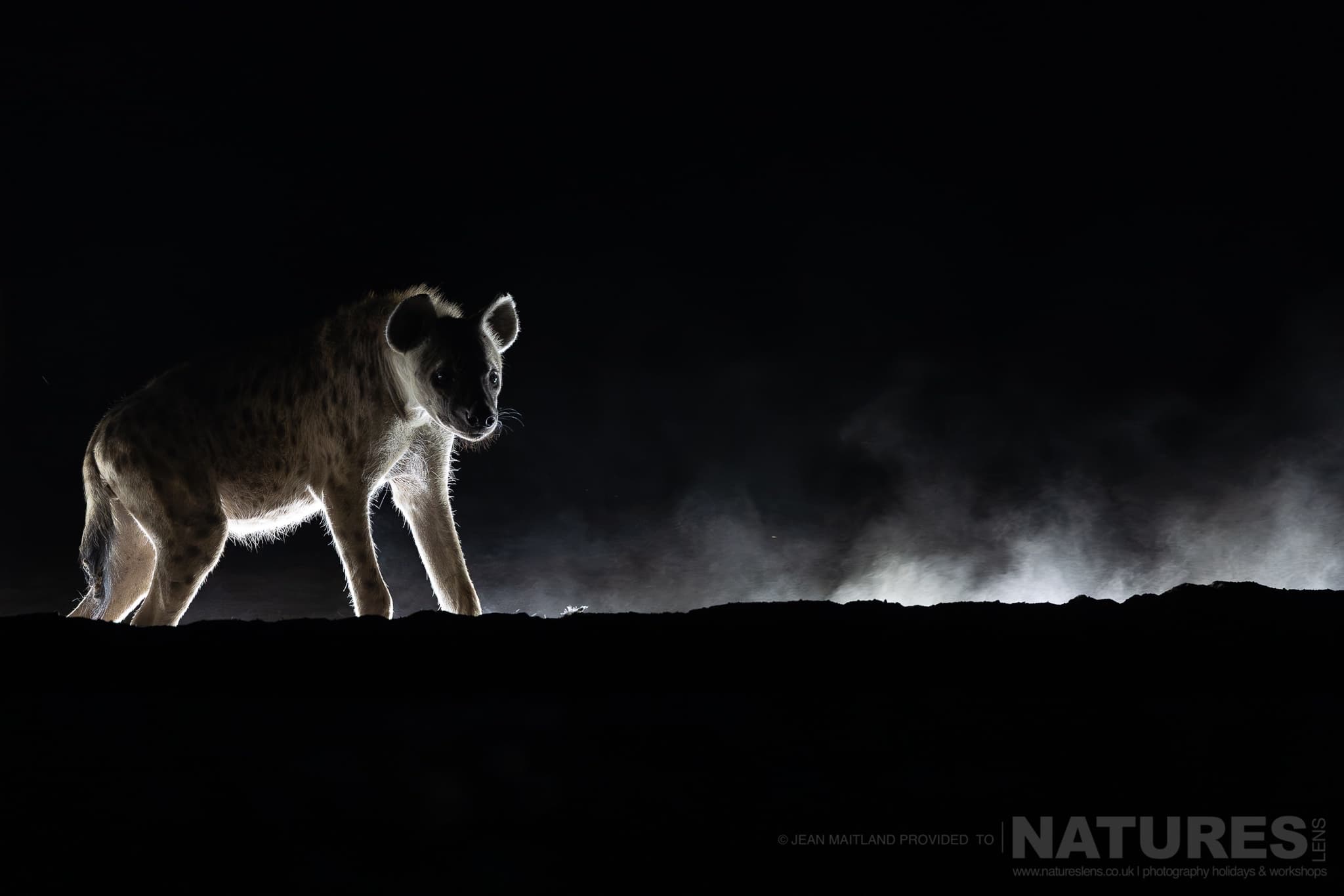 In October 2025, Jean Maitland, one of our regular NaturesLens guests, joined me for a week photographing the wildlife of Shompole Wilderness in southern Kenya. We divided our time between the Plains Hide & the Bush Hide, with each overnight session running from 5 pm through to around 9 am. Across those long nights we witnessed a wealth of wildlife – lions, leopards, elephants, zebra, giraffes, hyenas, buffalo, civets, wildcats, mongoose, wildebeest & more – all illuminated by Shompole’s excellent lighting setup. At time of writing this, October 2025, only the Plains Hide has backlighting, while both hides have superb front & side illumination.