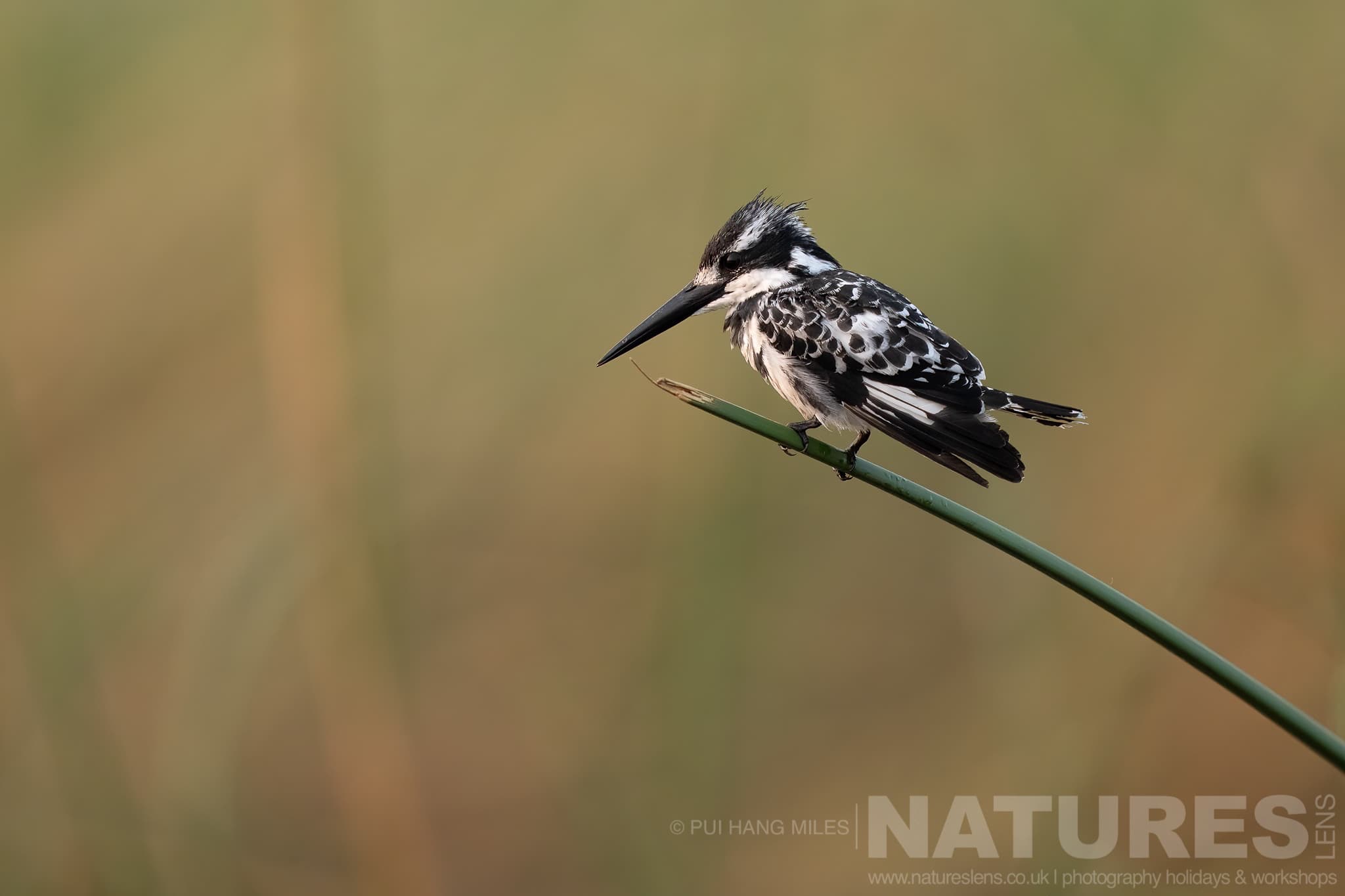 A pied kingfisher perched on reed captured during our Wildlife of the Chobe River photography holiday