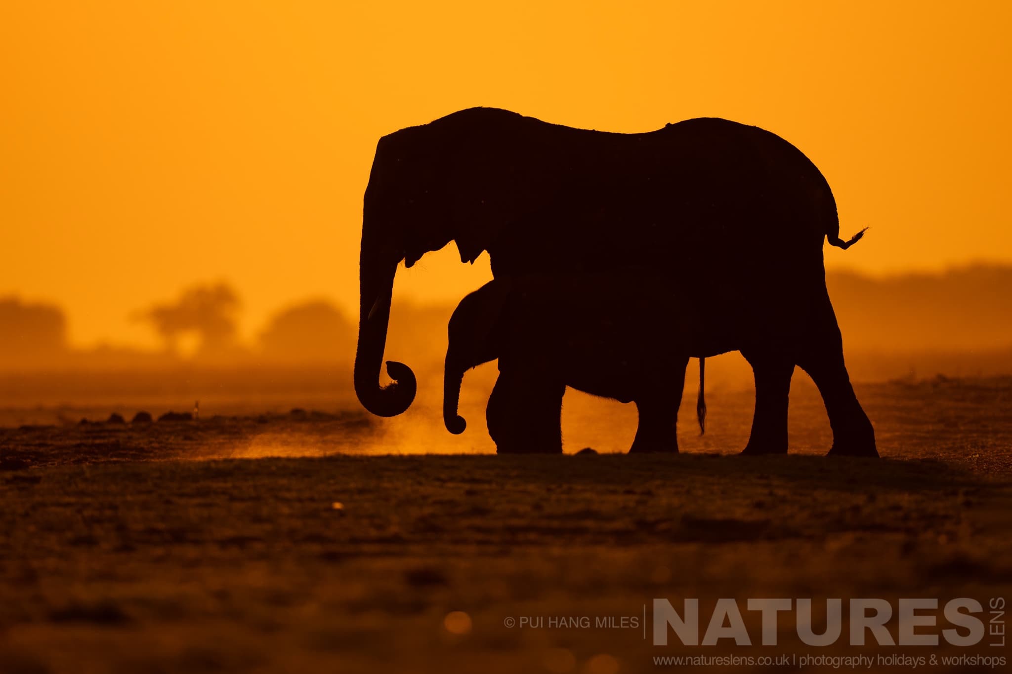 A Mother elephant & her calf silhouettes at sunset captured during our Wildlife of the Chobe River photography holiday